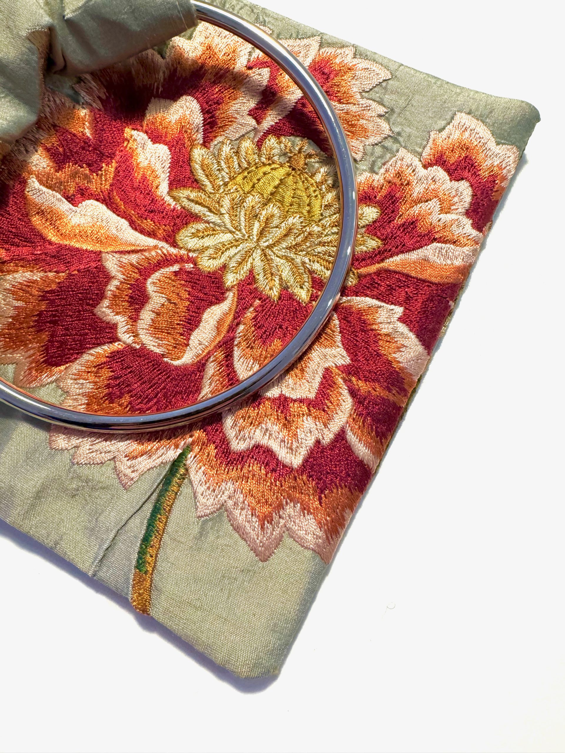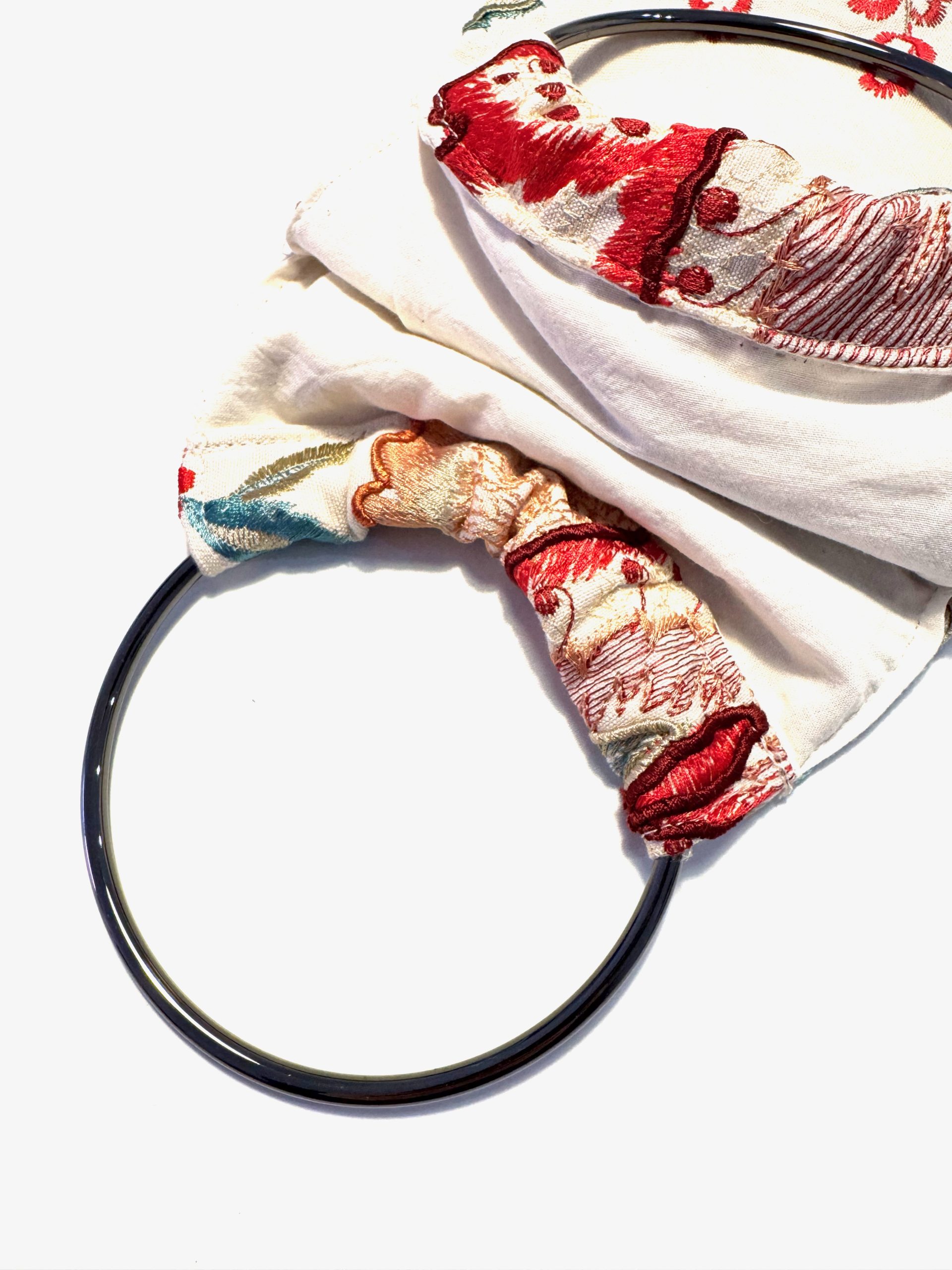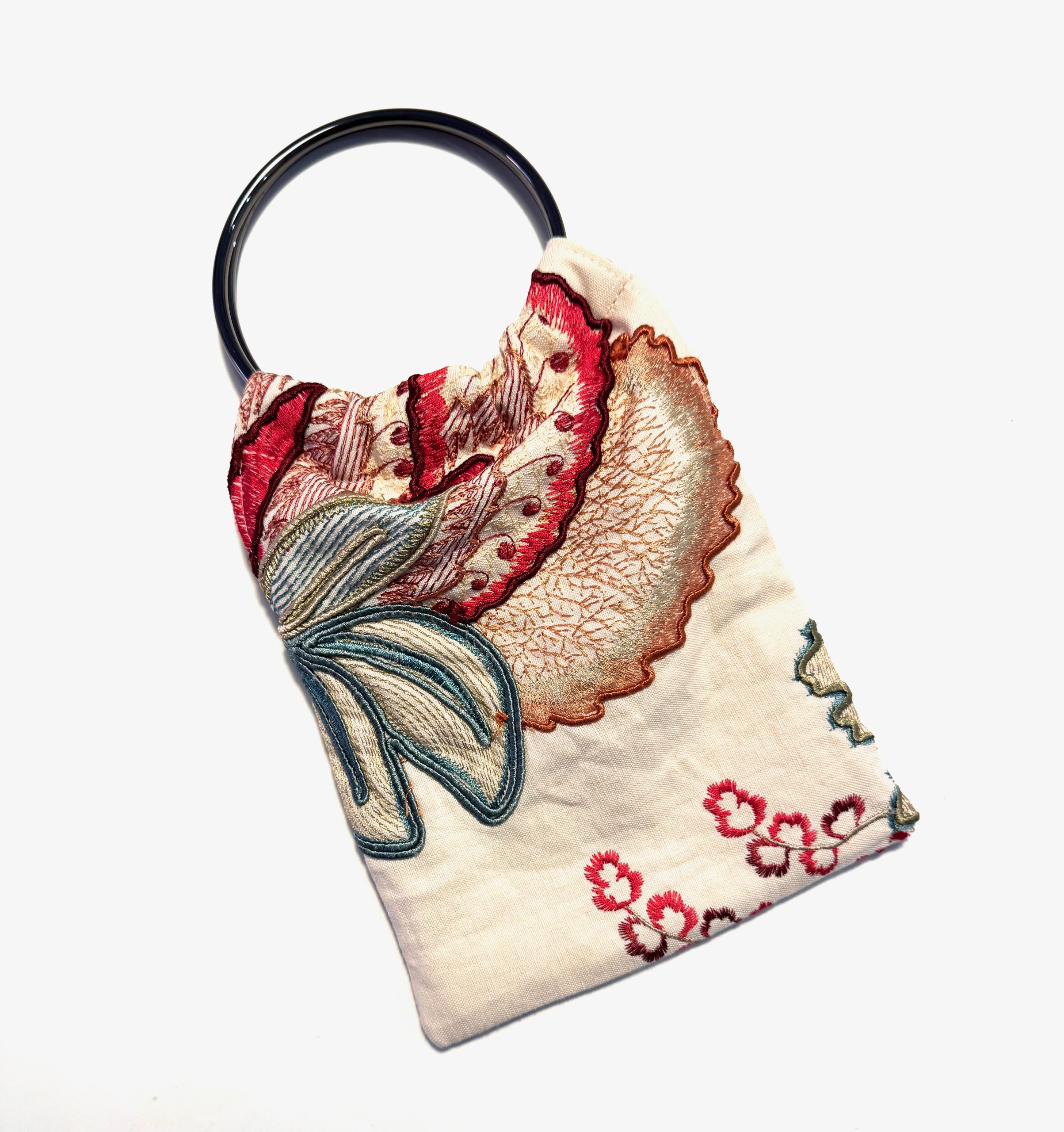 Hecho con tejidos de tapicería reciclados, de seda o lino bordados.