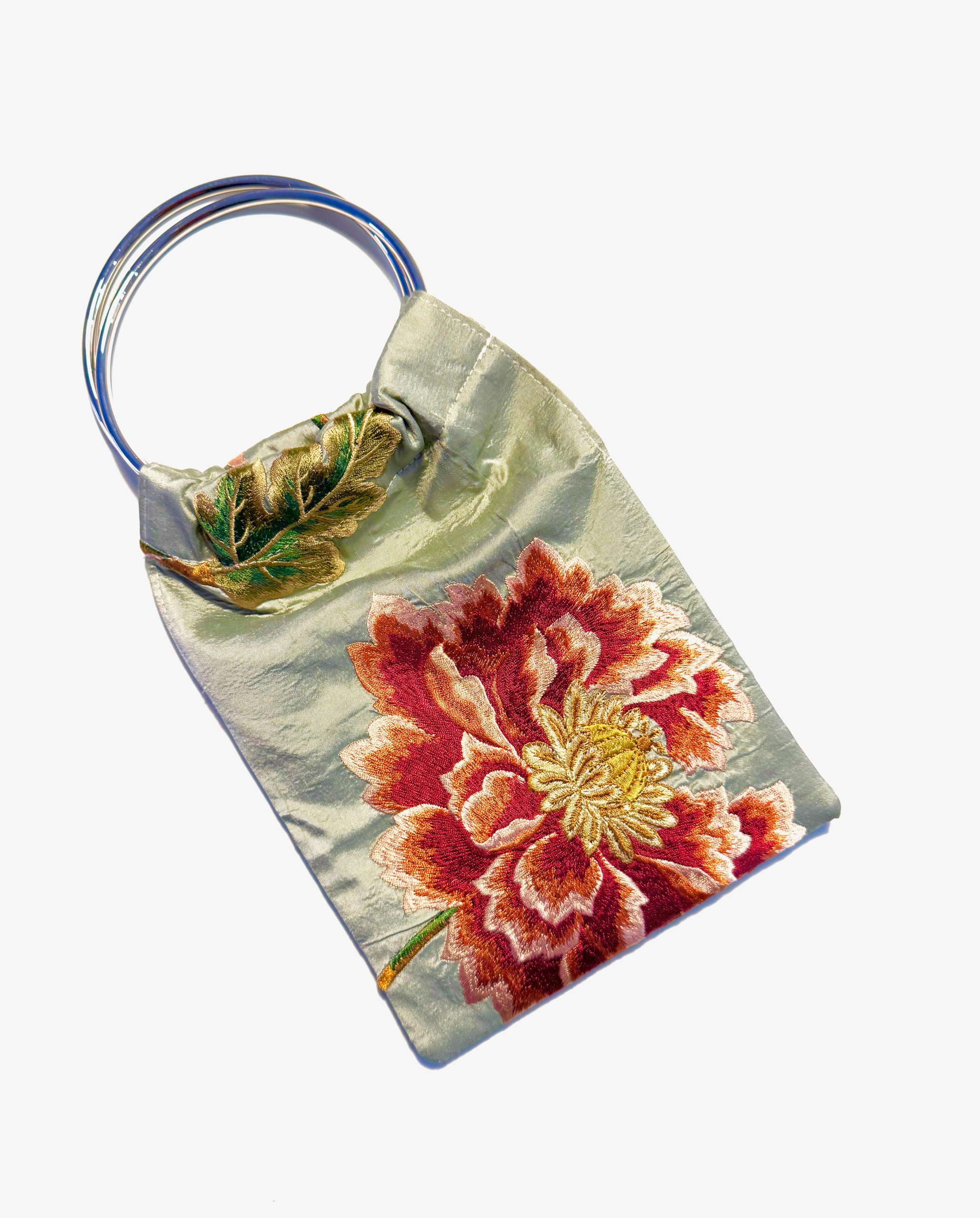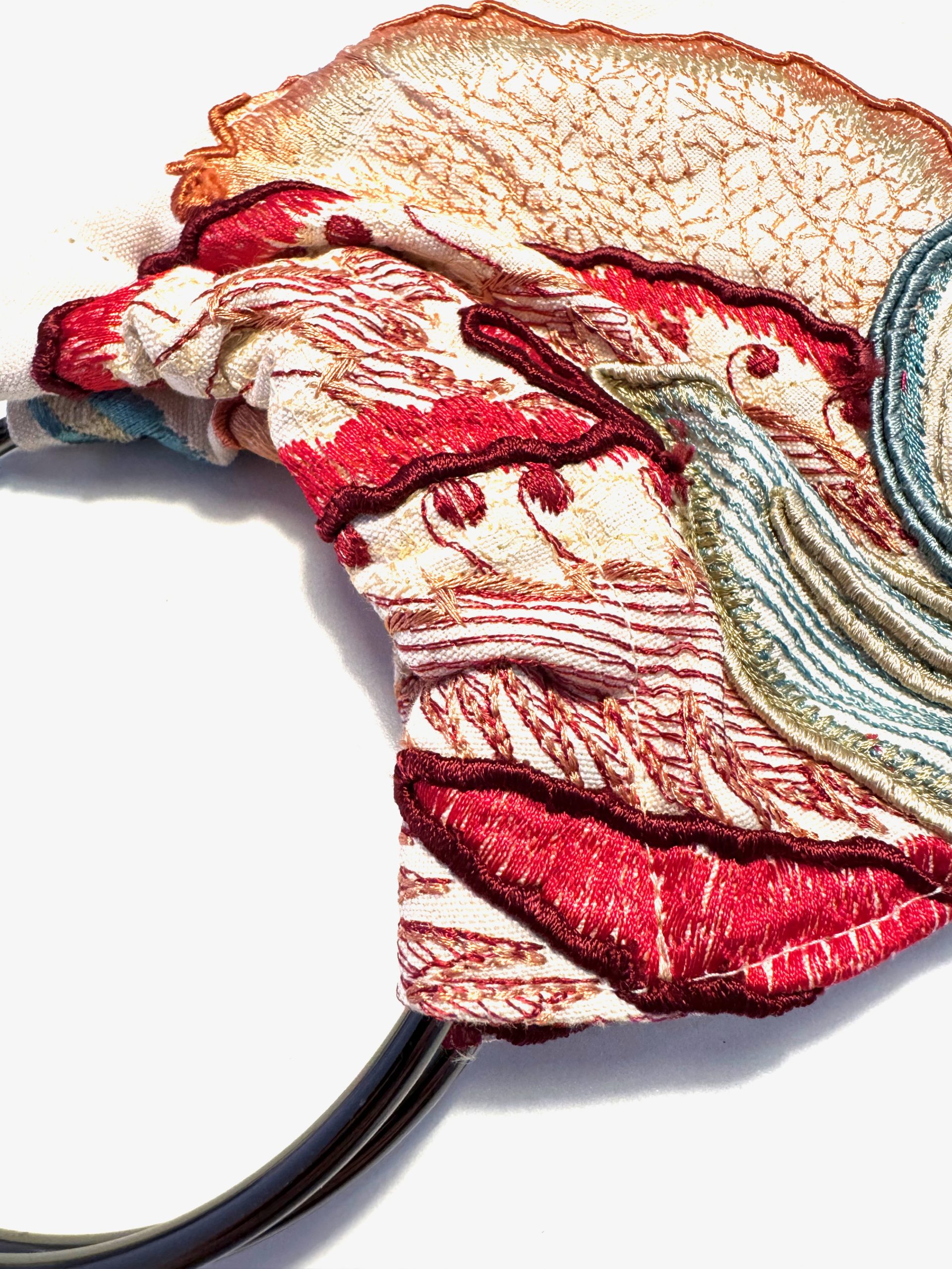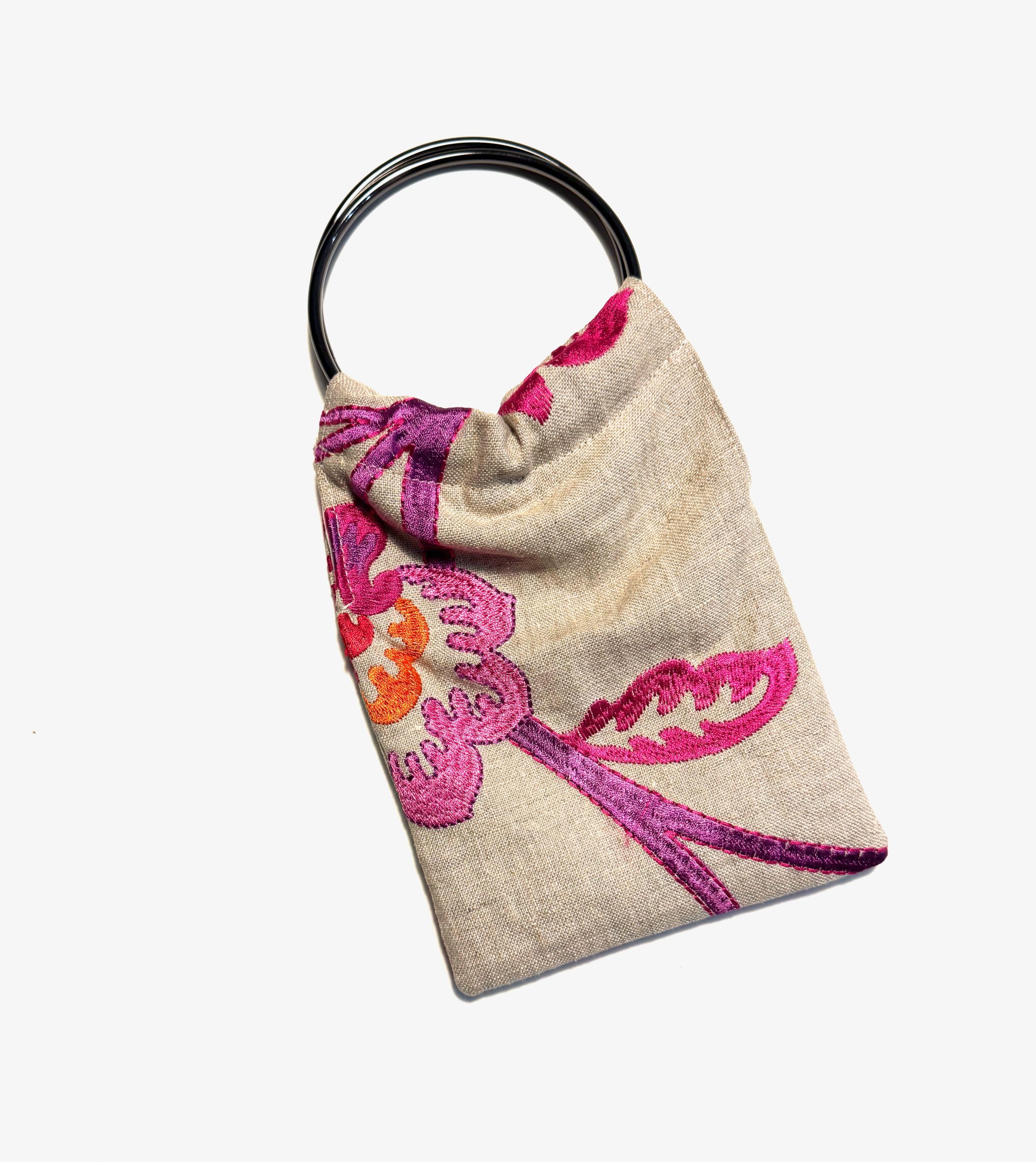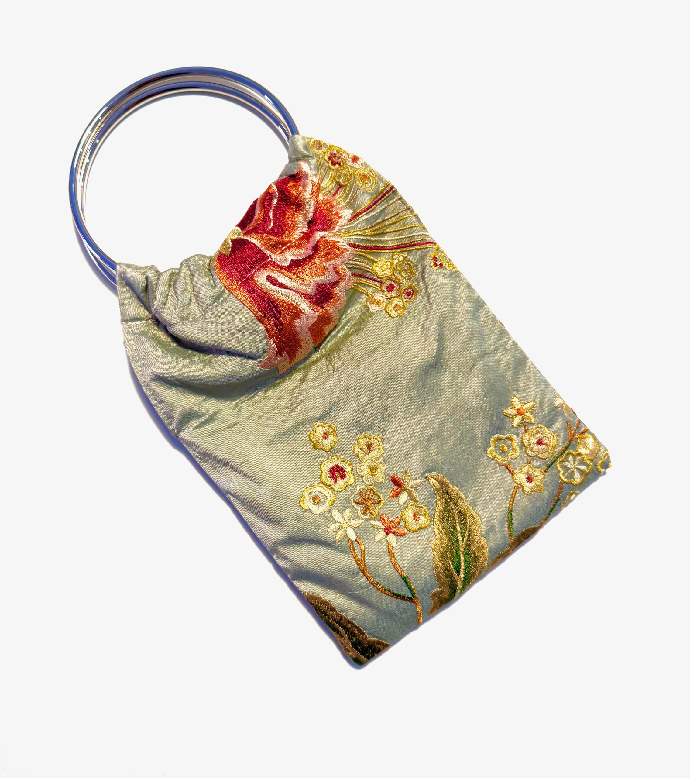 Hecho con tejidos de tapicería reciclados, de seda o lino bordados.