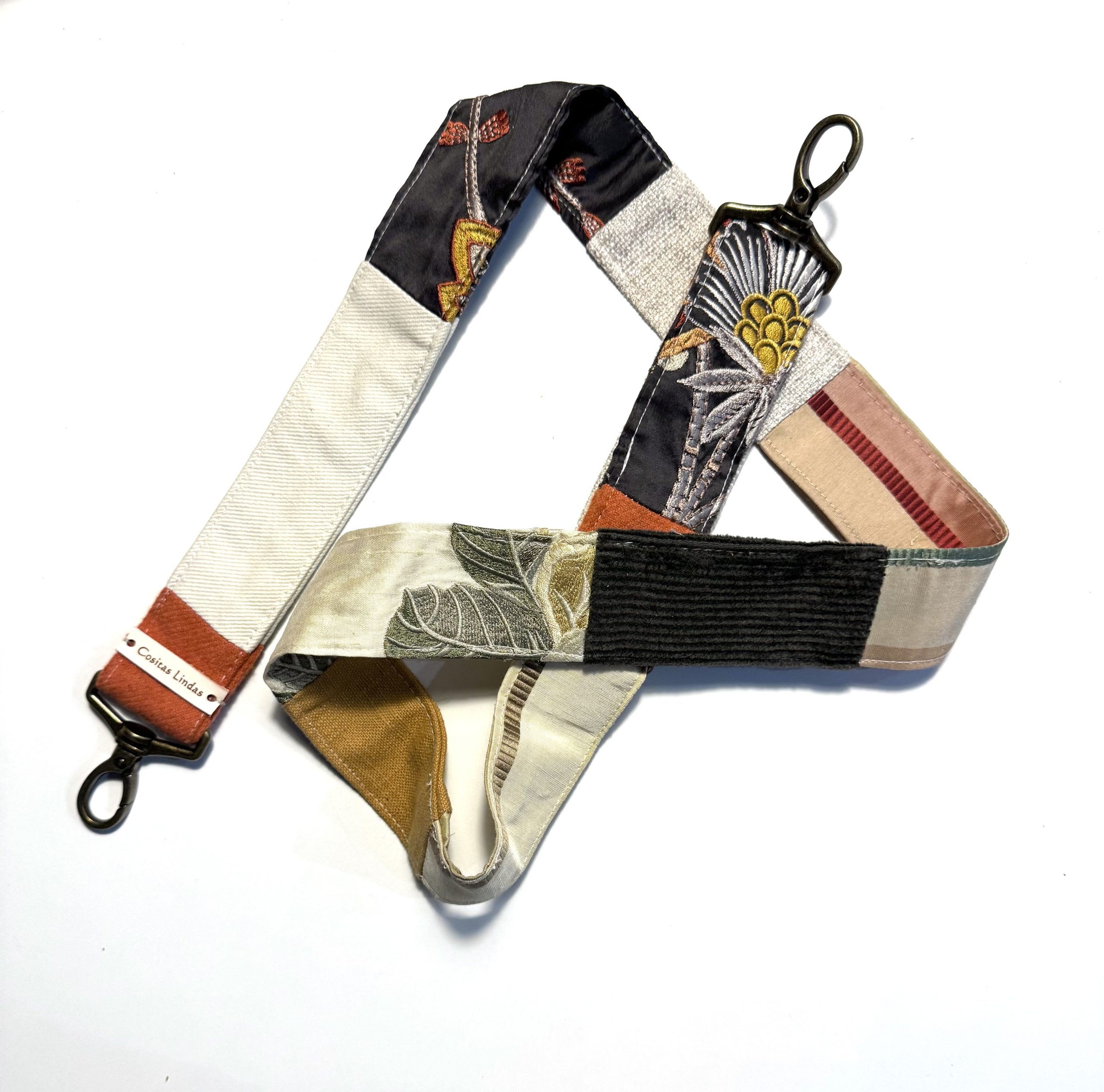 Cinta de bandolera ajustable, única, hecha a mano con tejanos y telas de tapicería reciclados.