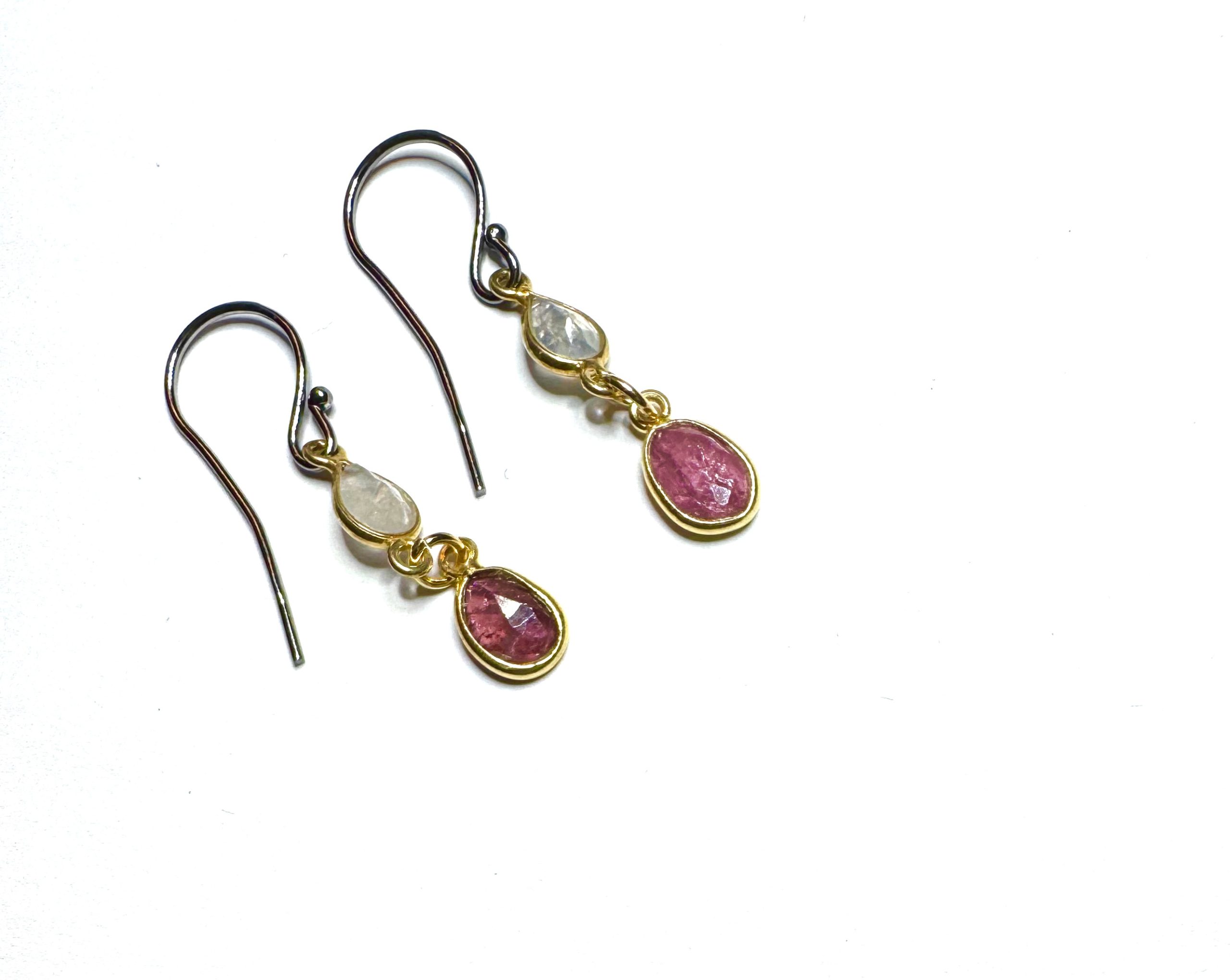 Pendientes hechos con piedra luna y turmalina de un rosa intenso.